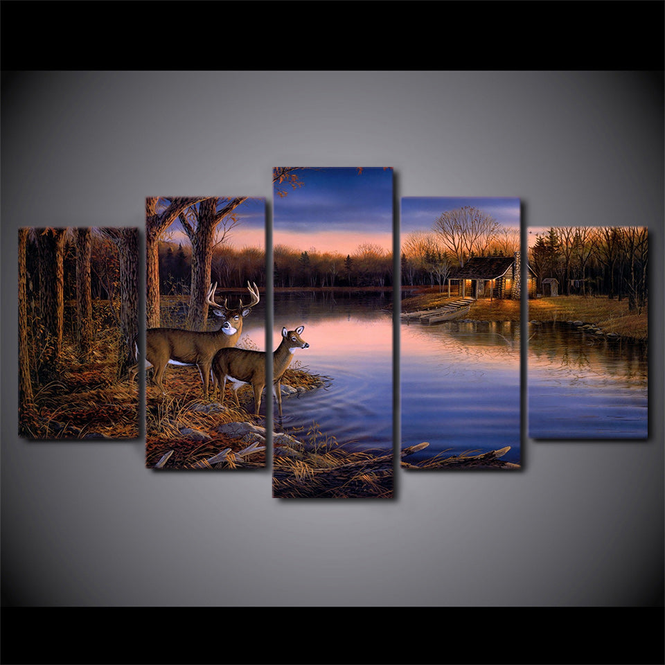 Limited Edition 5 Piece Couple Deer in the Lake Canvas